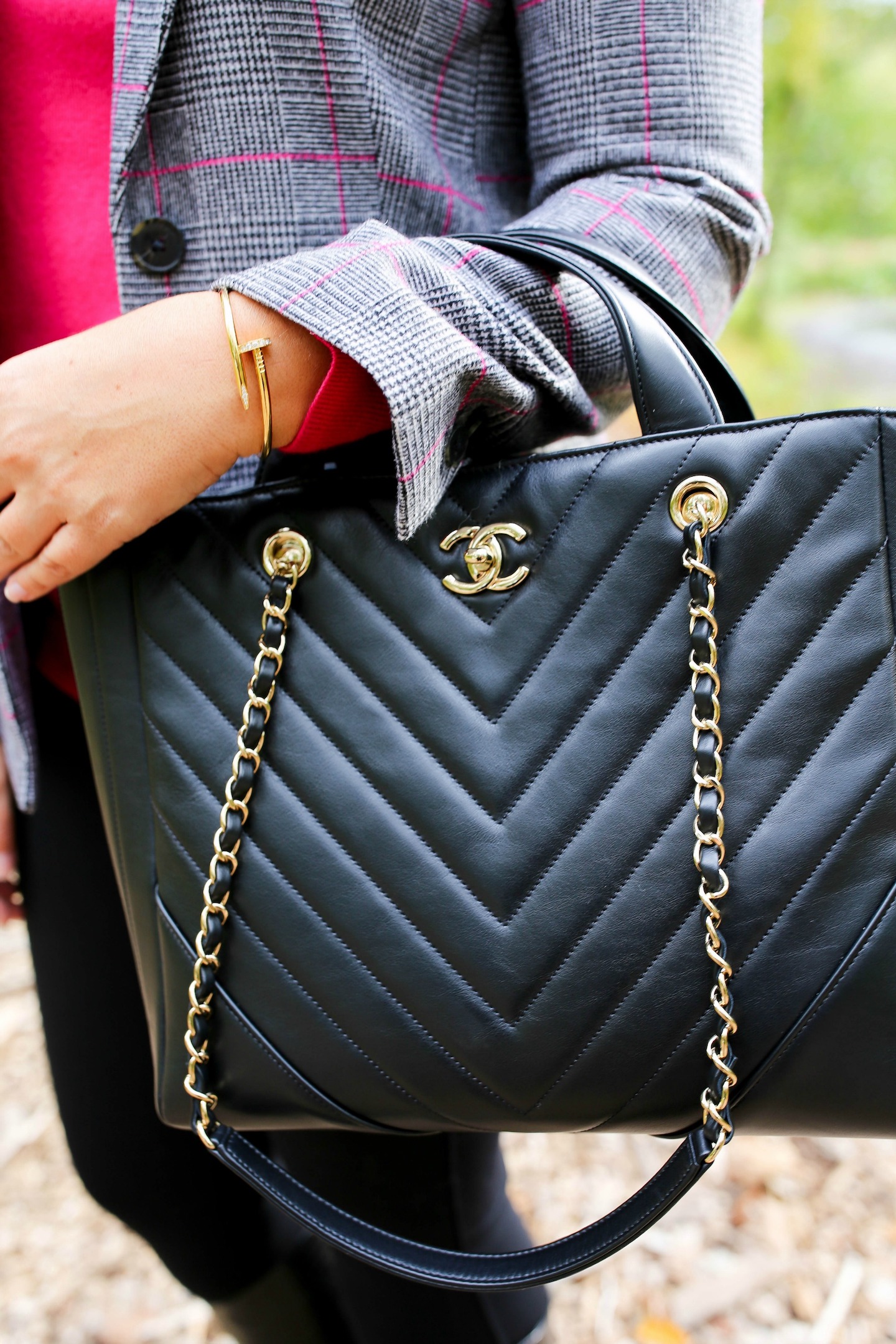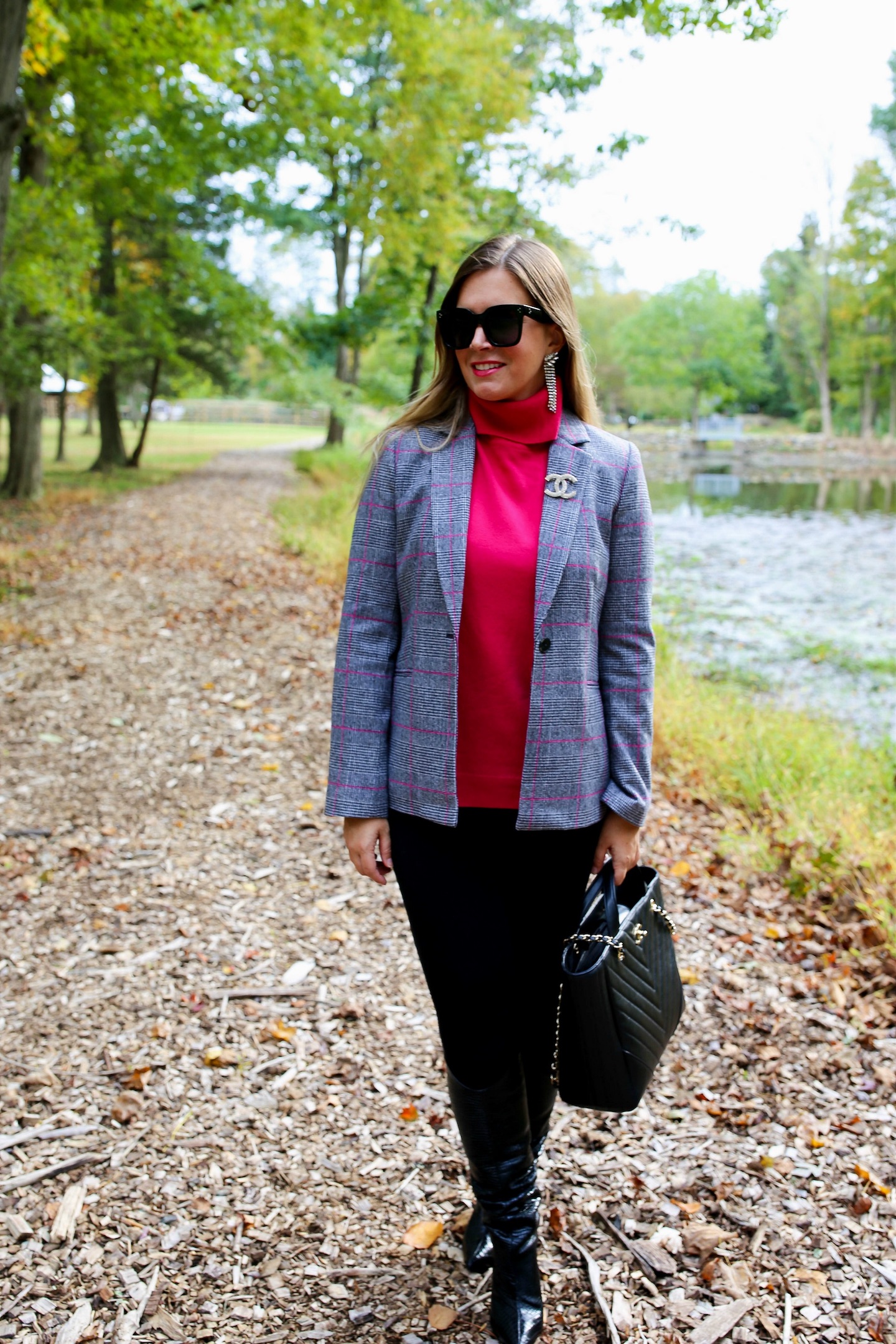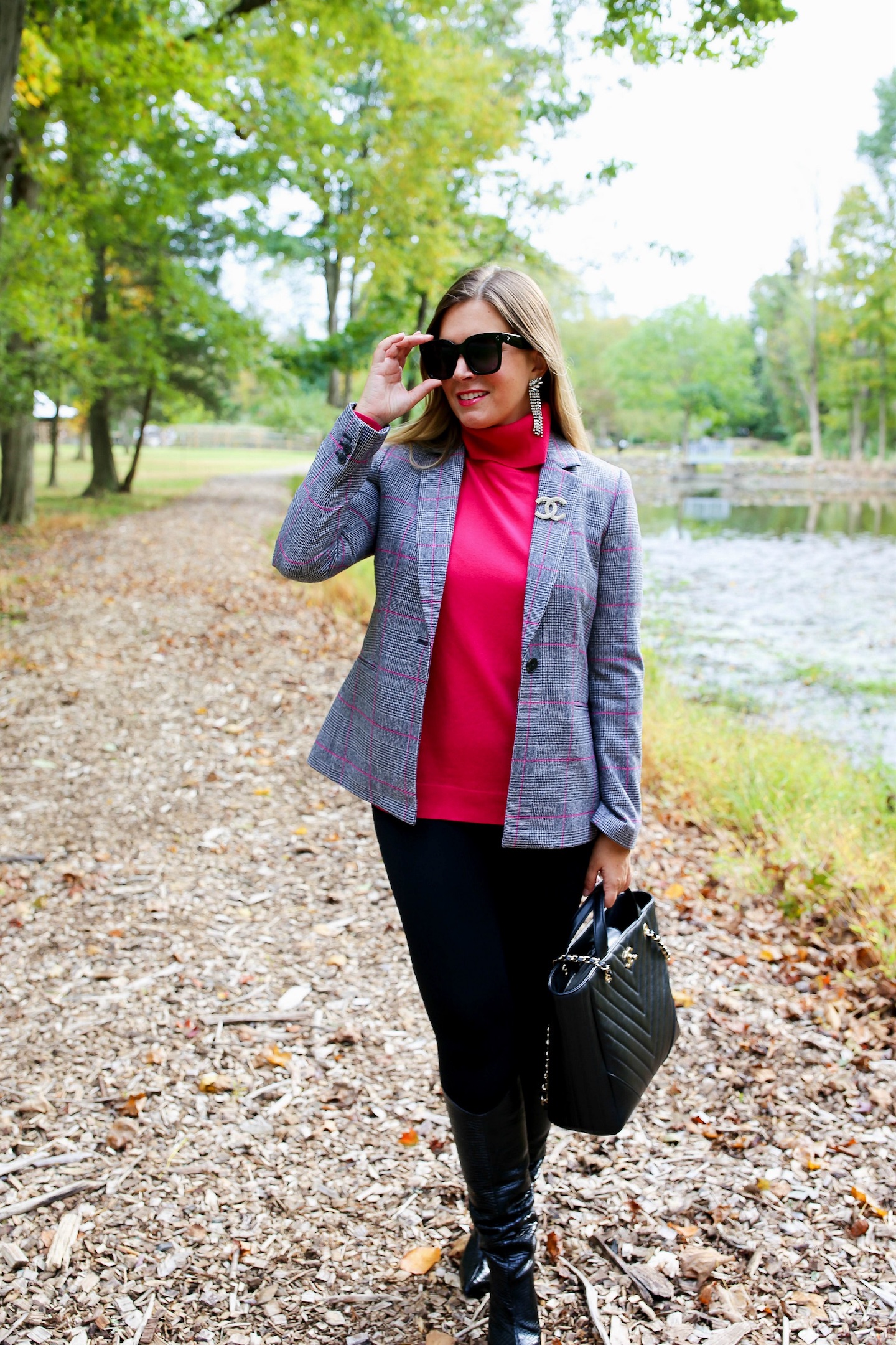Glen Plaid Blazer — fits TTS, wearing size 6 — only $70 plus an extra 15% off with code TOOGOOD (I also love this luxe version)  //  Perfect skinny black pants (fit TTS, wearing size small)  //  Pavé feather chain statement earrings (40% off with code GOBIG)  //  Snake-embossed leather boots — sized up a half size — 25% off right now for Friends & Family through 10/14, also available here and here  //  Chanel inspired brooch  //  Chanel large shopping bag in black — also love this gently owned one  //  Celine dupe sunnies — only $13! — real version here