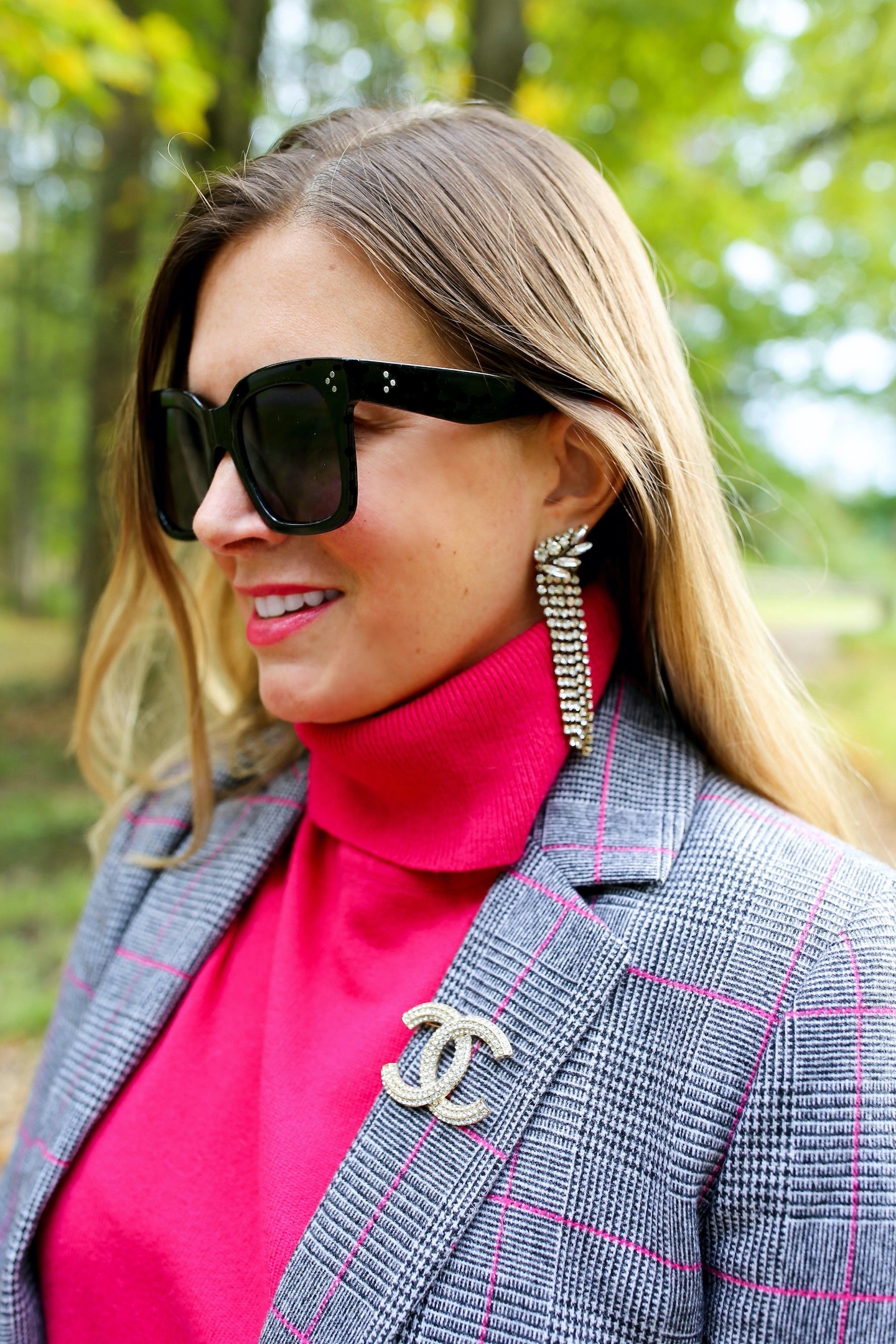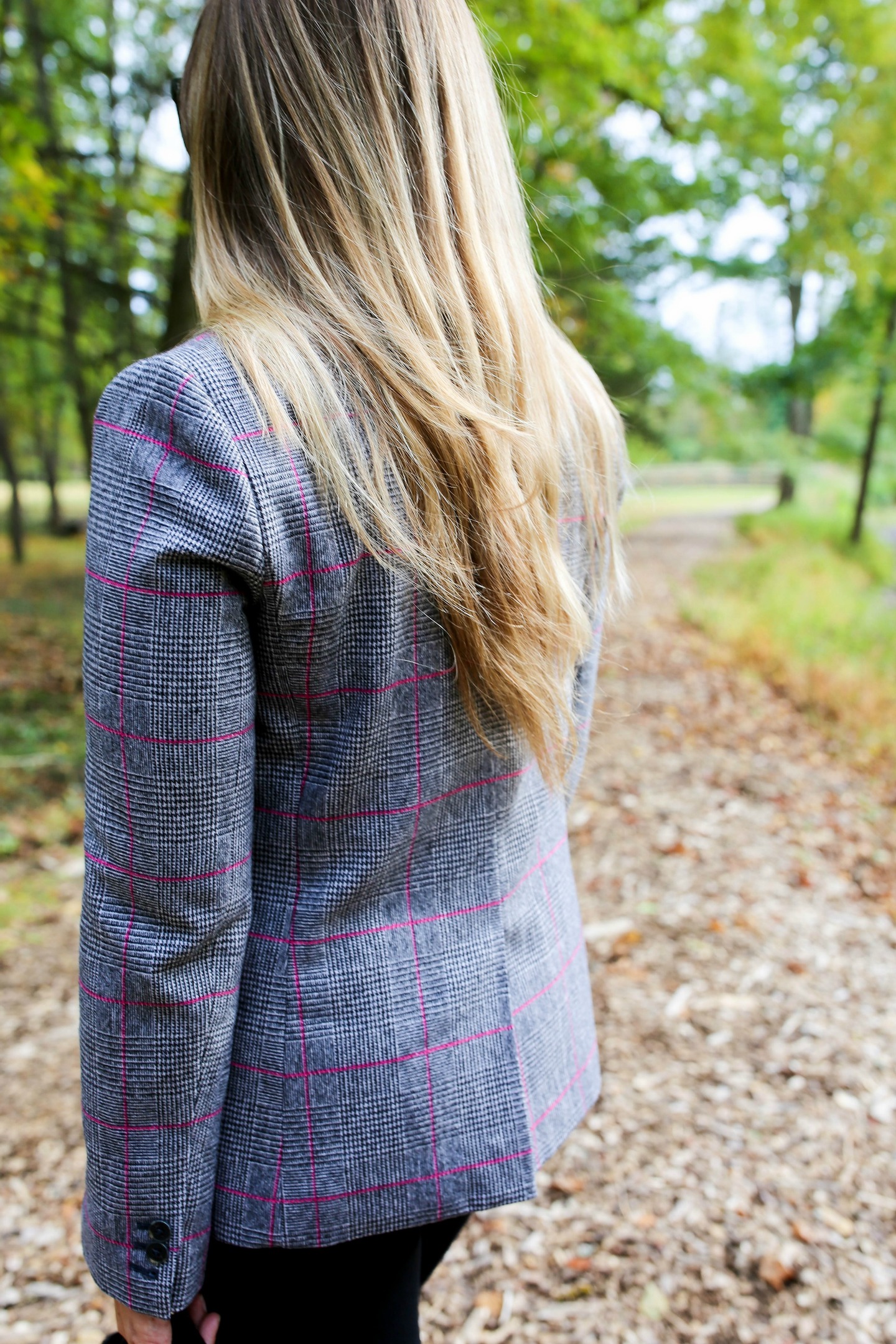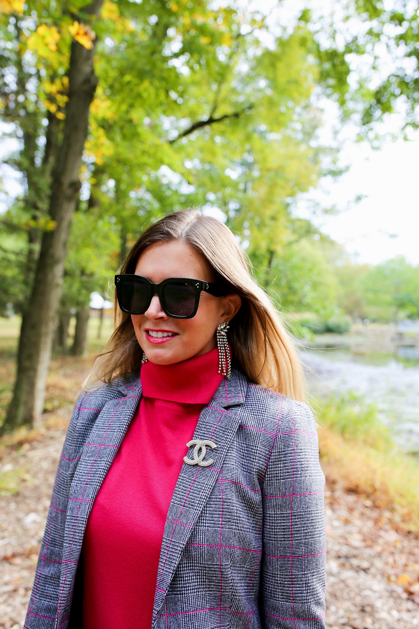 I’m styling another blazer look, because I can’t get enough of this cool fall weather.  These photos were taken a couple of weeks ago prior to the fall foliage really starting to kick in.  Bring on October!  I love this glen plaid blazer with the little accents of pink.  It adds a softness to the look — plus, any opportunity to wear pink is completely welcomed.