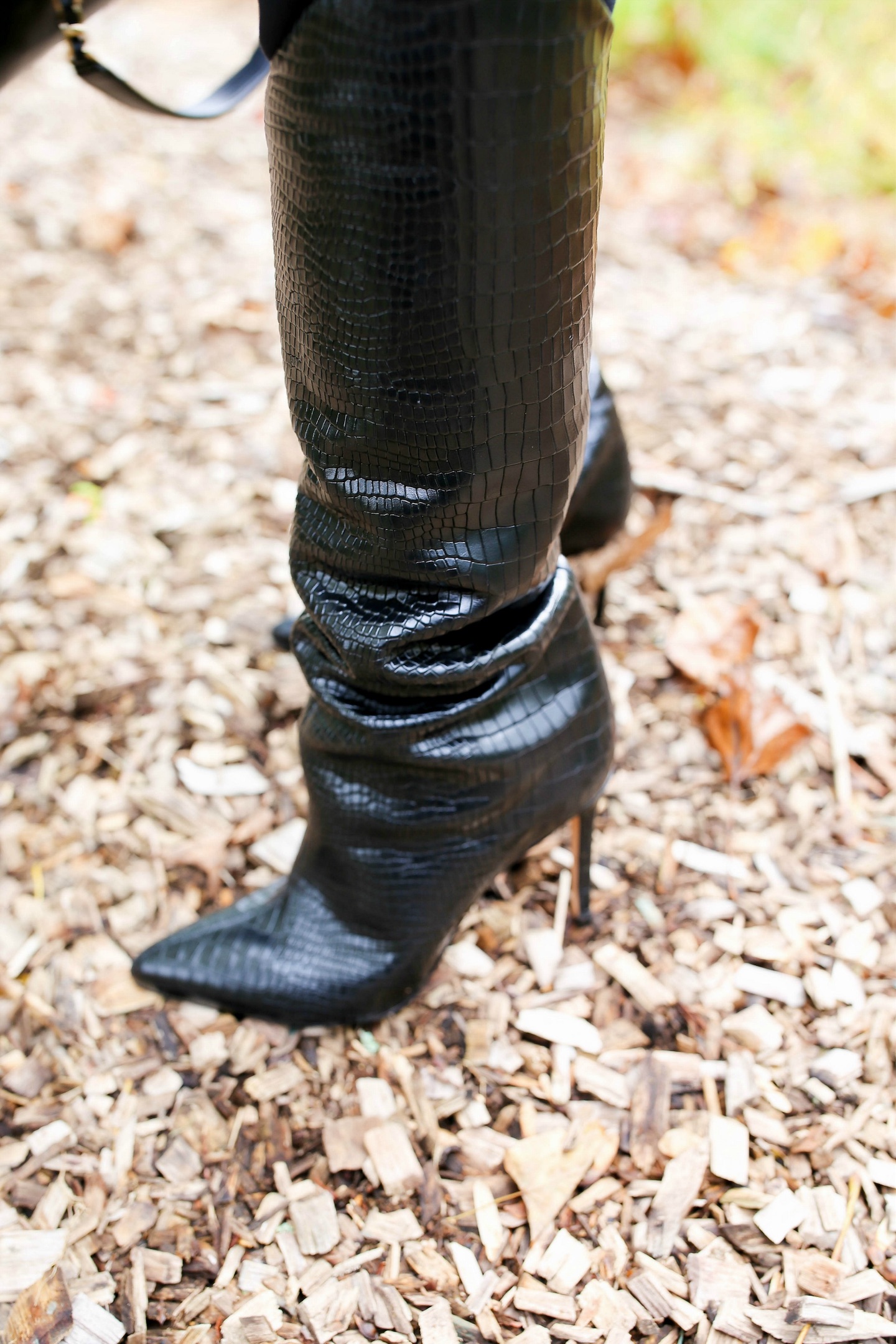 I styled this blazer with a pink cashmere turtleneck, statement crystal earrings, my fabulous Chanel inspired brooch that I styled in this post, and my new favorite leather boots.  These snake-embossed boots are truly fabulous and elevate any basic outfit.  I finally snagged them during Friends & Family, because they are 25% off now through 10/14.  My newest Chanel bag completes the look.  I love the versatility of this bag.  The long chain handles and shorter handles allow for varied arm carrying, and I love the chevron design.  I’ve officially dubbed this my new work bag! #treatyoself 😜